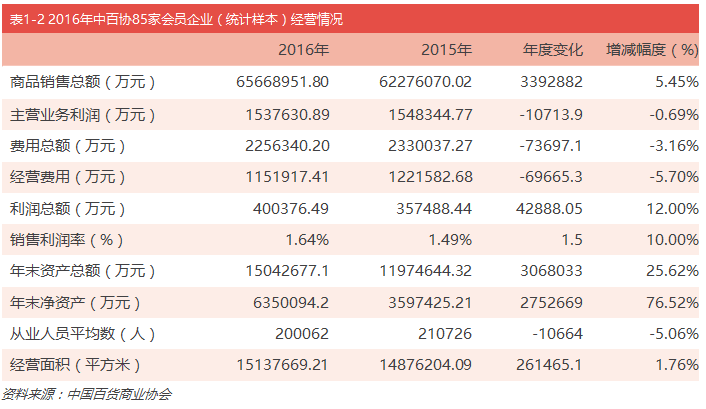 2016年中國百貨商業協會85家會員企業年度經營統計數據顯示,百貨店銷售總額6566.90億元,比2015年 的6227.61億元增長了5.45%;利潤總額為40.04億元,比2015年的35.75億元增長12.00%;主營業務利潤 為154億元,比2015年的155億元下降0.69%。年末資產總額達到1504.27億元,同比增長25.62%。2016  年會員企業經營面積有所增加,為1514萬平方米,同比增長1.76%。從業人員平均數為20萬人,比2015年 的21.萬人減少了5.06%(見表1-2)。