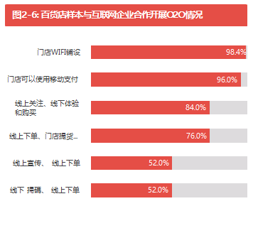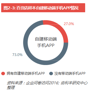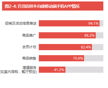 此外,27.0%的受訪百貨企業擁有自建移動端手機APP(見圖2-3)。他們主要通過手機APP進行促銷信息推送,商品銷售,為消費者提供如室內導購,餐廳預定等附加服務(見圖2-4)。