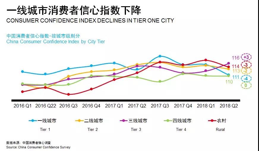 2018年第一季度數(shù)據(jù)來看,相比一線城市,三四線及農(nóng)村市場消費信心明顯強于一線城市,特別是三線城市,連續(xù)三個季度呈現(xiàn)增強趨勢。
