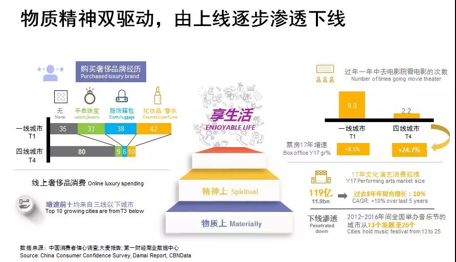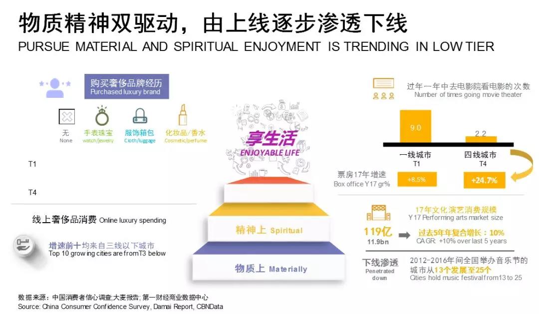 三四線城市消費者在收入和教育水平上和一線存在差距,但在消費上呈現(xiàn)高潛力,一線城市消費者則呈現(xiàn)消費回歸理性的傾向,三四線在享受與健康生活緊追一線,得益于三四線城市的超級消費者去感染帶動周邊的非潛力人群,推動下線整體。