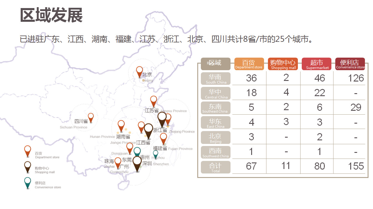 我們品牌有四個品牌,一個是天虹的便利店叫做微喔便利店,一個是天虹本身,面向中高端客戶,服務(wù)中產(chǎn)階級的家庭購物,我們有一個高端品牌叫君尚,比我們天虹本身更高的定位,還有一個超市,天虹在發(fā)展獨(dú)立超市的業(yè)態(tài)取的名字叫做space,我們天虹有八個省25個城市,天虹購物中心有四種業(yè)態(tài)。