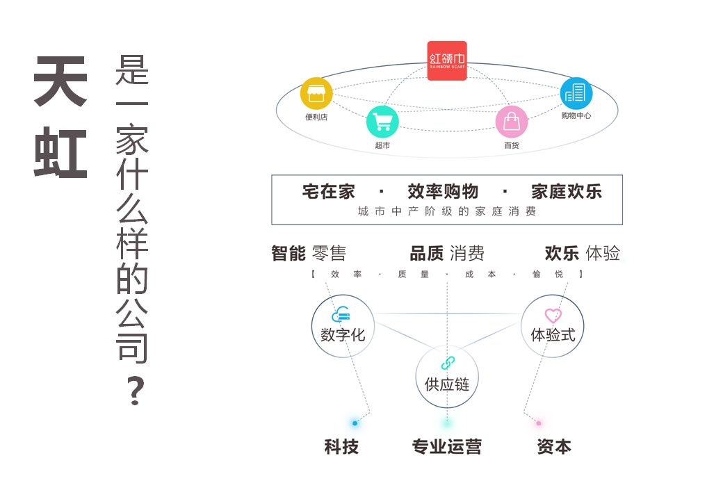 天虹的戰(zhàn)略核心三大主題詞是數(shù)字化、供應(yīng)鏈、體驗式,這是我們從2015年開始提出了天虹的三大戰(zhàn)略主題詞。基于數(shù)字化今天上午很多的分享都在講技術(shù)賦能,數(shù)字化對于零售各個環(huán)節(jié)的應(yīng)用,天虹也是一樣的,一會兒我會講一下天虹在數(shù)字化應(yīng)用上我們是如何應(yīng)用的。在供應(yīng)鏈上我們著力于打造為消費(fèi)者提供更好的品質(zhì)消費(fèi)。體驗式更著眼于目標(biāo),打造讓消費(fèi)者在我們購物環(huán)節(jié)過程中能夠有歡樂愉悅的體驗。我們也知道為了實現(xiàn)這三大戰(zhàn)略,技術(shù)、專業(yè)運(yùn)營和資本一定是非常根本的助力基礎(chǔ)。