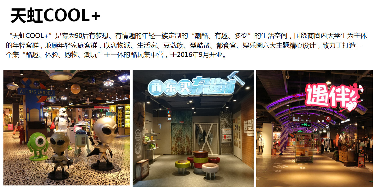 重點講一下這個案例,我們在南昌城市邊緣開了一家COOL+,這家店非常特殊,周圍沒有什么居民社區(qū),有七所大學(xué)的市場,當(dāng)時我們在天虹很少做這樣定位的市場,我們基本上圍繞社區(qū)或者城市中心店,三公里范圍內(nèi)有幾十萬人的中產(chǎn)階級消費(fèi)的家庭實體,這個店比較特殊,是一個大學(xué)生群體,基于這樣市場怎么做好精準(zhǔn)定位,這個過程中即使是一個嘗試,也是在這個過程中讓我們看到了精準(zhǔn)定位來實現(xiàn)百貨好的業(yè)績非常重要的關(guān)鍵,針對大學(xué)生的特點我們是為大學(xué)生特殊定制的一個商場,從設(shè)計的空間上,到品類的布局上,到提供的商品上,我們圍繞著大學(xué)生,包括我們把大學(xué)生分成一些生活派、戀物派,我們是基于這樣一些主題打造了不同的街區(qū),吃喝玩樂購的街區(qū),這個商場里面我們的零售比例比原來的百貨減少了,我們這個商場大概零售比例占了50%。更多做了一些體驗消費(fèi),我們考慮大學(xué)生其實是要喜歡聚、喜歡玩,同時我們在參與COOL+的名字也是大學(xué)生一起起的名字,我們選擇一個品類的時候,我們花了很多心思,比方我們選擇一家網(wǎng)吧,是篩選了200家網(wǎng)吧,找了四家有可能跟大學(xué)生匹配的網(wǎng)吧,由大學(xué)生一起參與,最后我們選定一家網(wǎng)吧,網(wǎng)吧有很多不是所有都是大學(xué)生喜歡的網(wǎng)吧,所以我們是這樣去打造這樣一個類別。