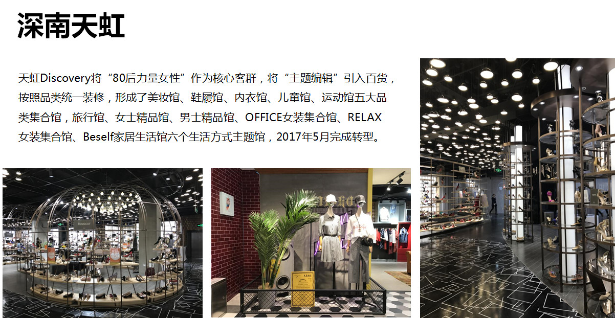 深南天虹大家也知道,其實在一個傳統(tǒng)的老的天虹百貨,地處的位置比較好,是深圳華強(qiáng)北的商圈,我們打造了一個以80后力量女性為主的,我們首次嘗試主體編輯,將主體編輯納入百貨,這個是基于跟日本百貨的學(xué)習(xí)。我們把一些品類進(jìn)行了整合和統(tǒng)一裝修,形成了美妝館、鞋旅館、內(nèi)衣館、兒童館、運(yùn)動館,同時考慮女性的消費(fèi)特征不同的生活場景打造了OFFICE館、RELAX館,休假獨(dú)家的時候穿什么,上班的時候我的包、我的服飾、我的飾品,是基于生活場景進(jìn)行打造的。在這樣獨(dú)體下,我們發(fā)現(xiàn)在顧客效率也很高,同時在很多區(qū)域設(shè)計上也得到行業(yè)肯定。這也是我們首次把主題編輯引進(jìn)了百貨。