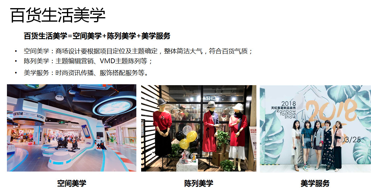 在生活美學(xué),因為天虹百貨是我們主要的業(yè)態(tài),我們在百貨上強(qiáng)調(diào)打造生活美學(xué),包括三個方面,一個是空間美學(xué),一個是陳列美學(xué),一個是美學(xué)服務(wù)。在這個部分天虹大概已經(jīng)花了兩三年的時間,我們也有我們專門的手冊和為消費(fèi)者專門打造的一些沙龍服務(wù),這個方面也為顧客不是搭配專業(yè)服務(wù)方面收到一個比較好的效果。