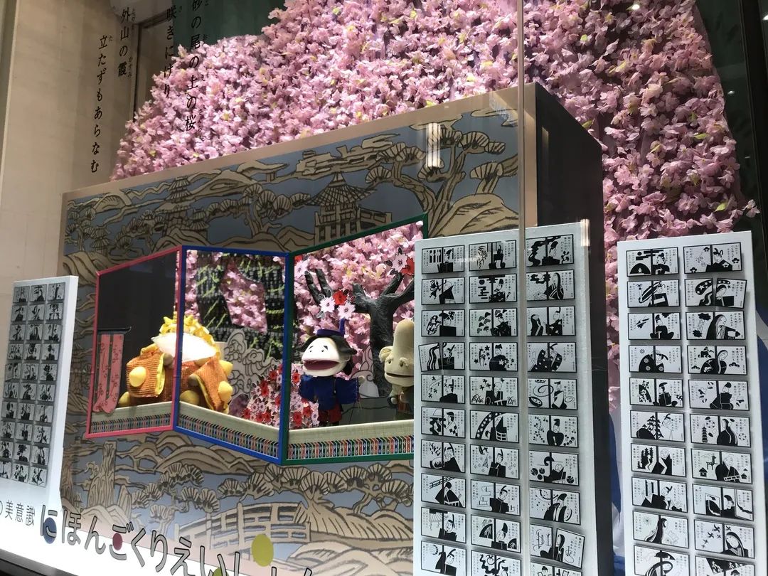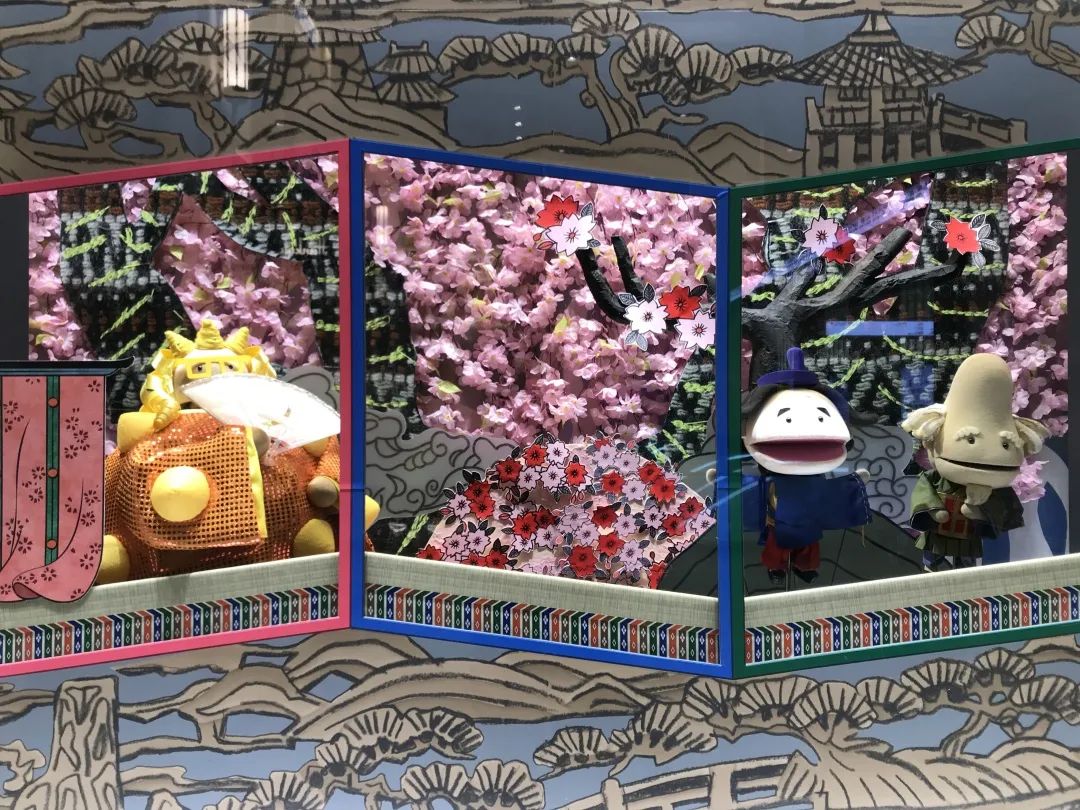 櫥窗再現了被稱為“太夫”的人一邊講著故事、一邊彈著三味線的情景,三位人偶師操縱著一個人偶,用人偶凈琉璃文樂的形式表演繞口令。