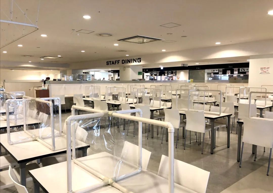 員工休息時使用的員工食堂內的餐桌上,配置了塑料安全隔離膜來防止飛沫傳染。相鄰座位為保持安全的間隔,貼上了宣傳單來隔離座位。另外,在與其他商戶進行商談的會議室里,設置了亞克力隔板。