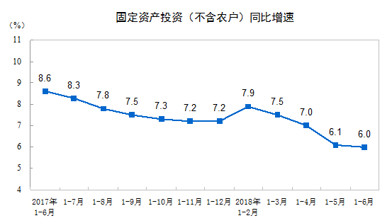 在投資上,2018年1-6月份,全國固定資產(chǎn)投資(不含農(nóng)戶)297316億元,同比增長6%,增速比1-5月份回落0.1個百分點,與去年同期相比回落2.6個百分點。