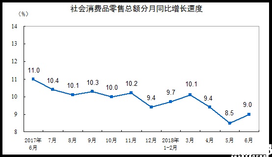 在經(jīng)歷了2017年的復蘇后,今年社零情況又開始嚴峻起來。據(jù)國家統(tǒng)計局數(shù)據(jù)顯示,6月份我國社零總額為30842億元,同比增長9%,雖比5月的8.5%略有回升,但仍處于今年的低位。