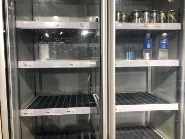 這家門店面積較大,約有40平方米,貨架上的貨物擺得并不滿,最里面的冰柜空蕩蕩的,不知是因為生意太好還是其他原因。盒子里沒有任何生鮮商品,都是保質期較長的產品,并且每個商品上都貼著標簽,價格也并不比普通的便利店便宜。
