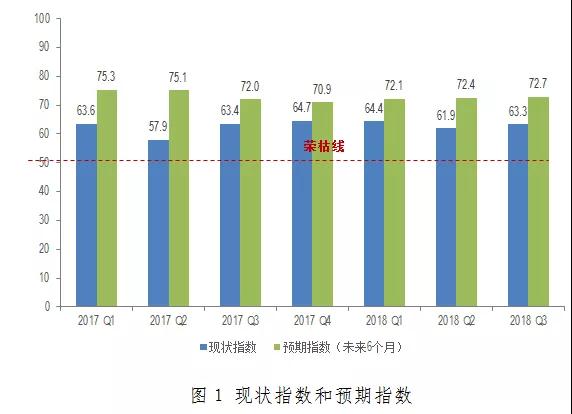 其中,現(xiàn)狀指數(shù)為63.3,環(huán)比上升1.4,同比微跌0.1,高出榮枯線13.3。季度環(huán)比下,現(xiàn)狀指數(shù)出現(xiàn)明顯回升,受益于整體消費(fèi)市場的平穩(wěn)增長。三季度,社會(huì)消費(fèi)品零售總額月度增速在9.0%上下波動(dòng),較二季度波幅逐漸收窄,并呈現(xiàn)穩(wěn)步回升的趨勢(shì)。但與去年同期增速相比,仍然減緩1.1個(gè)百分點(diǎn),使得現(xiàn)狀指數(shù)同比輕微下滑。
