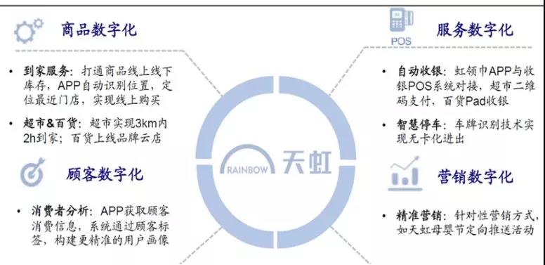 (2)百貨:采用品牌云店模式,品牌商“虹領巾”上設立數字化專柜,將其實體專柜的商品上架到虛擬云店,顧客在門店和APP上均可選購商品,百貨數字化建設正在穩步推進,進一步優化百貨體驗與服務有效性,預計2019年基本完成。