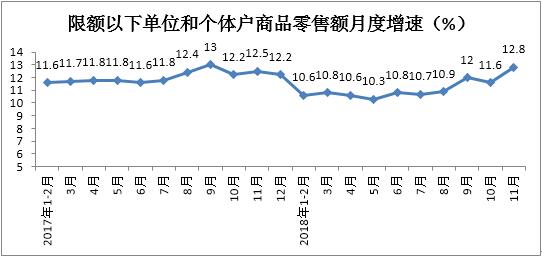 據測算,1-11月份,限額以下單位和個體戶商品零售額實現184326億元,累計增長11%,增速較1-10月份提高0.2個百分點。1-11月份,限額以下單位和個體戶商品零售額對商品零售總額增長的貢獻率為72.2%,占商品零售總額的比重為60.1%。