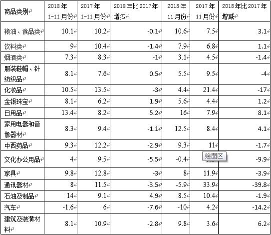 1-11月份,商品零售額實現306799億元,累計增長9.0%,增速與1-10月份放緩0.1個百分點。其中11月份同比增長8%,增速較上月放緩0.5個百分點。