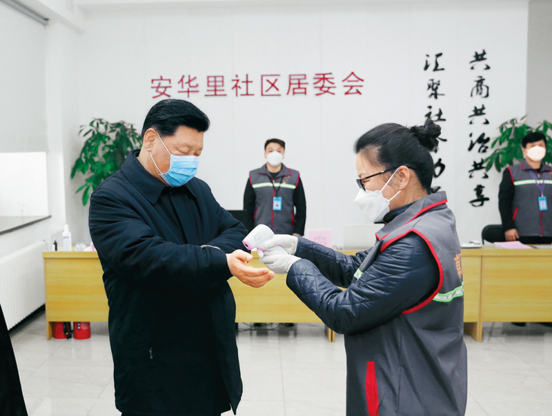 2020年2月10日,中共中央總書記、國家主席、中央軍委主席習(xí)近平在北京調(diào)研指導(dǎo)新冠肺炎疫情防控工作。這是習(xí)近平來到朝陽區(qū)安貞街道安華里社區(qū),了解基層一線疫情聯(lián)防聯(lián)控情況。新華社記者 鞠鵬/攝